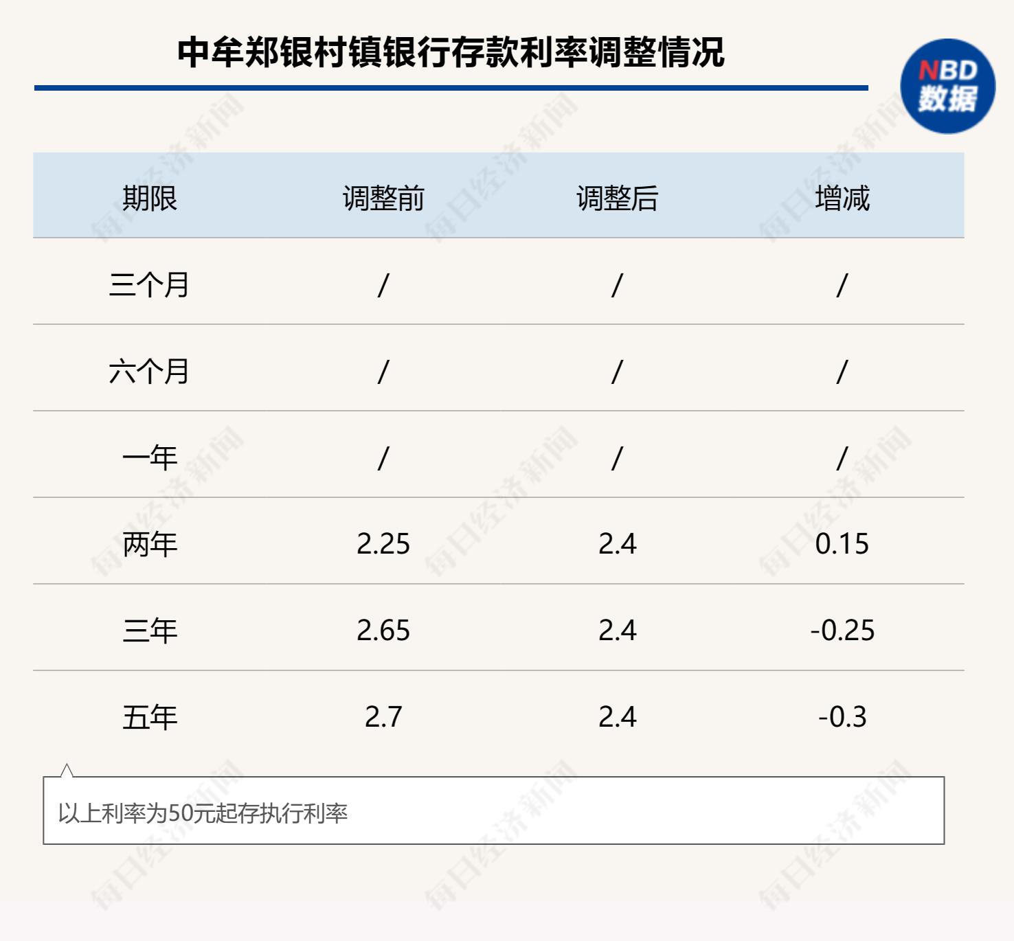 中牟郑银村镇银行公告自本月8日起,两年期存款利率上调15BP,三年期、五年期存量利率分别下调25BP、30BP,调整后的两年期、三年期、五年期存款利率均为2.40%;