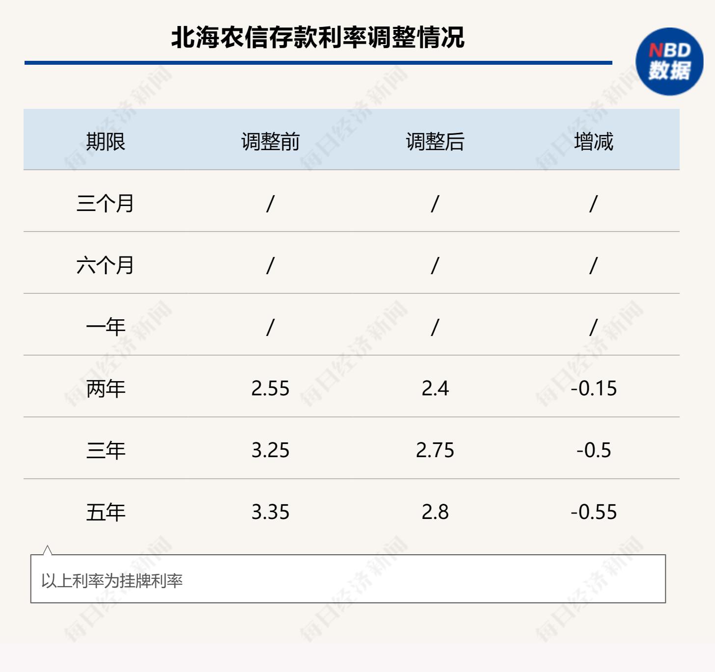 12月12日,北海农信发布消息,称北海市区联社将自12月15日起,调整人民币定期存款整存整取二年、三年和五年期产品挂牌利率,其他产品挂牌利率不变。调整后,二年期定期存款整存整取挂牌利率为2.4%,三年期为2.75%,五年期为2.8%。