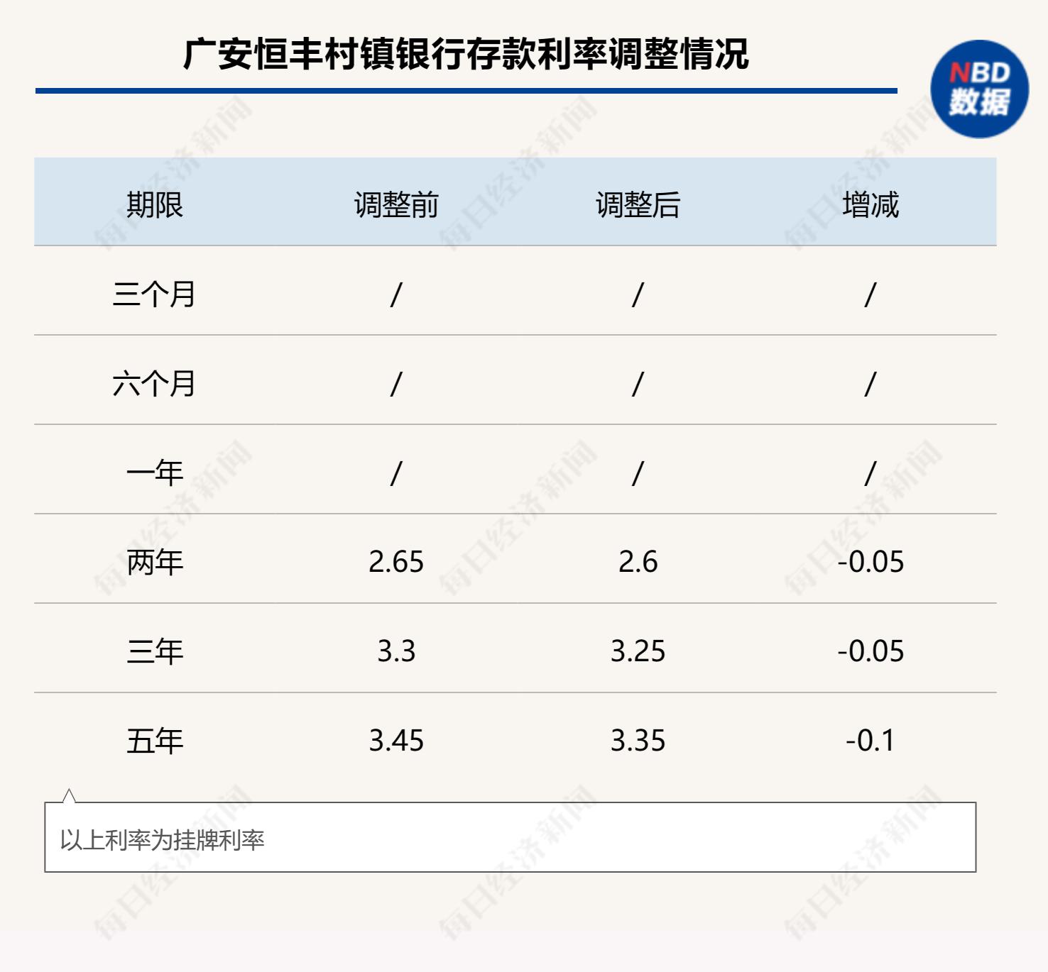12月14日,广安恒丰村镇银行发布公告,自12月15日起调整人民币存款挂牌利率,整存整取2年、3年、5年期个人定期存款利率分别为2.60%、3.25%、3.35%,较此前分别调降5BP、5BP、10BP。