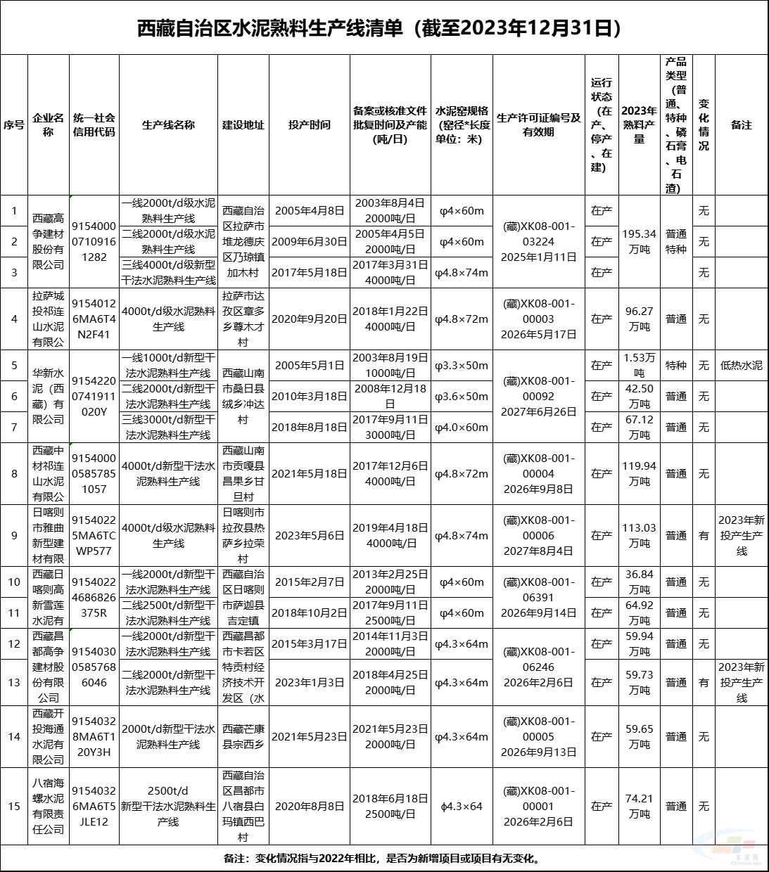 公告中显示,截止于2023年12月31日,西藏全区共有15条水泥熟料生产线。其中,有两条生产线为2023年新增生产线,分别为西藏昌都高争建材股份有限公司的二线2000t/d新型干法水泥熟料生产线,日喀则市雅曲新型建材有限公司的4000t/d级水泥熟料生产线。
