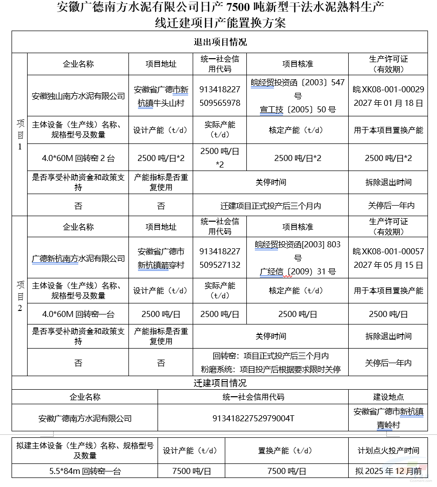 安徽广德南方水泥有限公司将拆除三条2500t/d熟料生产线,投资27.1亿元迁建一条7500t/d规模的绿色智能二代新型干法水泥示范生产线。该项目计划2025年12月前点火投产,新线投产后三个月内将关闭原有生产线,相关设备将在一年内拆除。这是天山股份旗下南方水泥有限公司的子公司广德独山南方水泥和广德新杭南方水泥的对外投资行为。