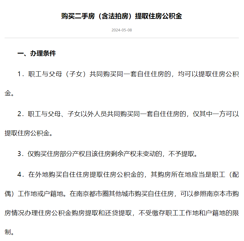 购买二手房(含法拍房)提取住房公积金,办理条件包括职工与父母(子女)共同购买同一套自住住房的,均可以提取住房公积金。职工与父母、子女以外人员共同购买同一套自住住房的,仅其中一方可以提取住房公积金。仅购买住房部分产权且该住房剩余产权未变动的,不予提取。在外地购买自住住房提取住房公积金的,其购房所在地应当是职工(配偶)工作地或户籍地。在南京都市圈其他城市购买自住住房,可以参照南京本市购房情况办理住房公积金购房提取和还贷提取,不受缴存职工工作地和户籍地的限制。职工购买第三套及以上住房,其本人因购房已提取过两次及以上住房公积金的,不予提取;其配偶因购房已提取过两次及以上住房公积金的,不予提取;若购买的房产在《不动产权证书》发证之日前一年内发生产权变动并已提取住房公积金的,提取间隔时间须满一年。