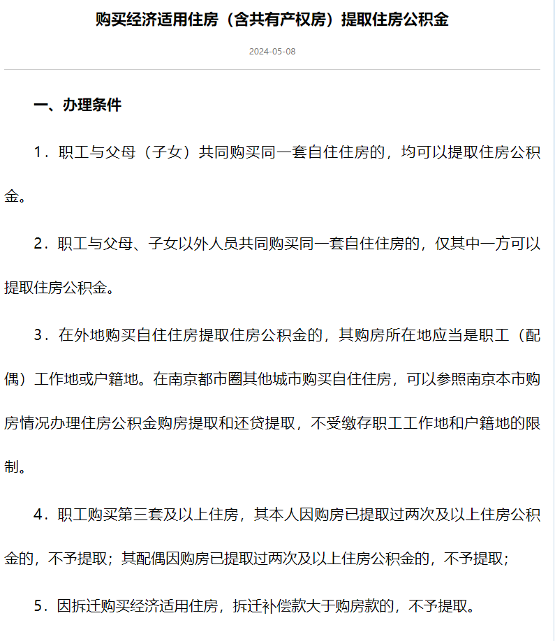 购买经济适用住房(含共有产权房)提取住房公积金,职工与父母(子女)共同购买同一套自住住房的,均可以提取住房公积金。职工与父母、子女以外人员共同购买同一套自住住房的,仅其中一方可以提取住房公积金。在外地购买自住住房提取住房公积金的,其购房所在地应当是职工(配偶)工作地或户籍地。在南京都市圈其他城市购买自住住房,可以参照南京本市购房情况办理住房公积金购房提取和还贷提取,不受缴存职工工作地和户籍地的限制。职工购买第三套及以上住房,其本人因购房已提取过两次及以上住房公积金的,不予提取;其配偶因购房已提取过两次及以上住房公积金的,不予提取;因拆迁购买经济适用住房,拆迁补偿款大于购房款的,不予提取。