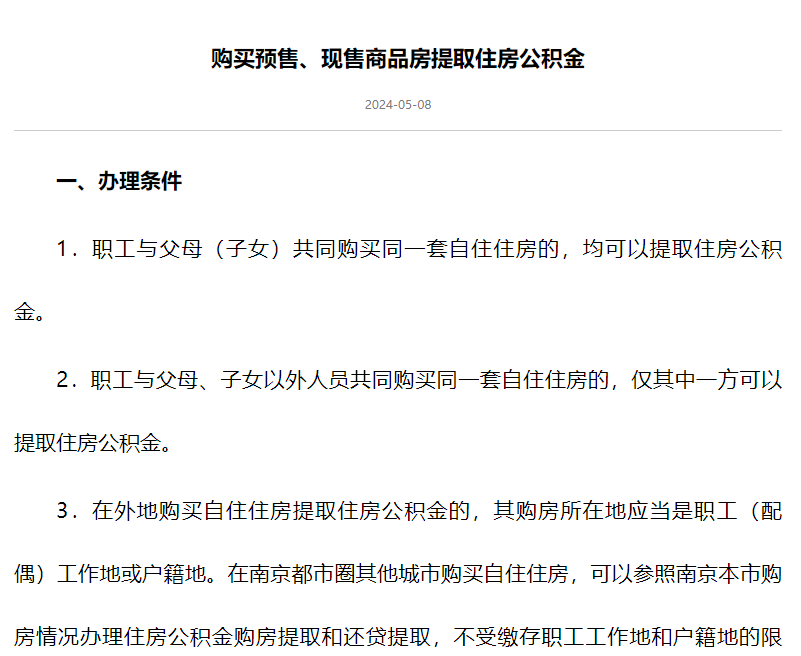 购买预售、现售商品房提取住房公积金,办理条件包括职工与父母(子女)共同购买同一套自住住房的,均可以提取住房公积金。职工与父母、子女以外人员共同购买同一套自住住房的,仅其中一方可以提取住房公积金。在外地购买自住住房提取住房公积金的,其购房所在地应当是职工(配偶)工作地或户籍地。在南京都市圈其他城市购买自住住房,可以参照南京本市购房情况办理住房公积金购房提取和还贷提取,不受缴存职工工作地和户籍地的限制。职工购买第三套及以上住房,其本人因购房已提取过两次及以上住房公积金的,不予提取。其配偶因购房已提取过两次及以上住房公积金的,不予提取。