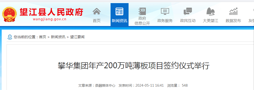 5月10日,望江经开区管委会与攀华集团有限公司年产200万吨薄板项目在张家港市举行签约仪式。