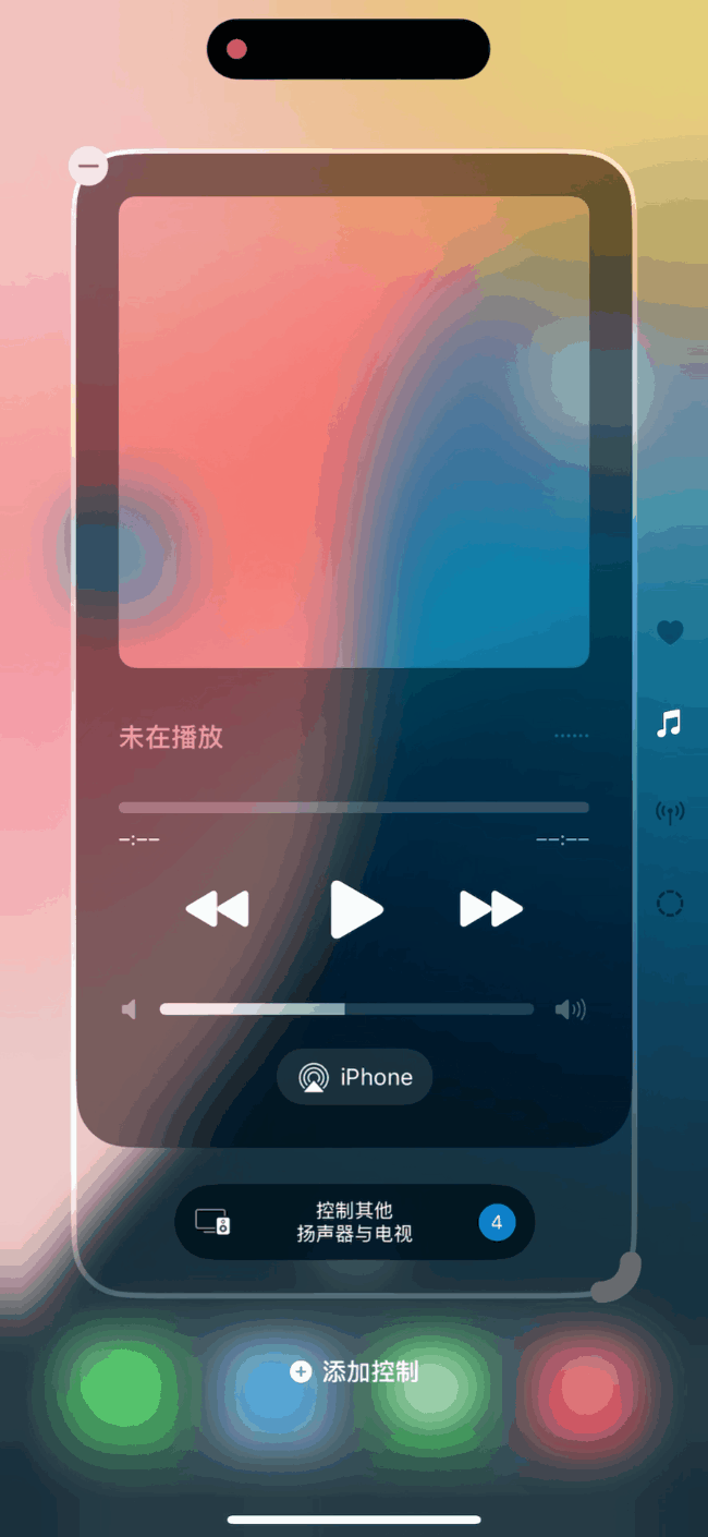 这个拖动方式同样适用于控制中心的音乐播放界面,可以将它缩的很小,只占据四个格子,也可以放到很大,整个页面都是音乐播放界面。