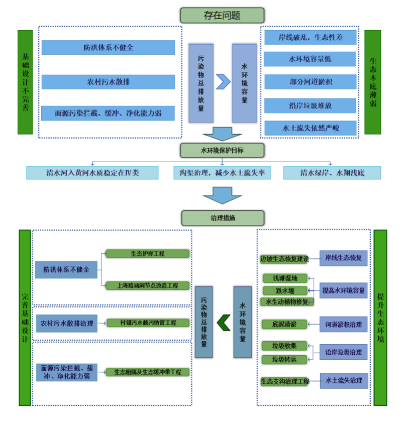 针对本项目生态基底薄弱,防洪体系不健全,沿途河村关系不清,人河关系矛盾紧张等现状,宁夏院勘察设计团队因地制宜,立足长远,精心谋划,围绕核心理念和目标,设计出了包括:生态护岸工程、截污纳管工程、生态阻隔及生态缓冲带工程、生态沟渠治理工程、水生态修复及水质净化工程5大类建设内容。