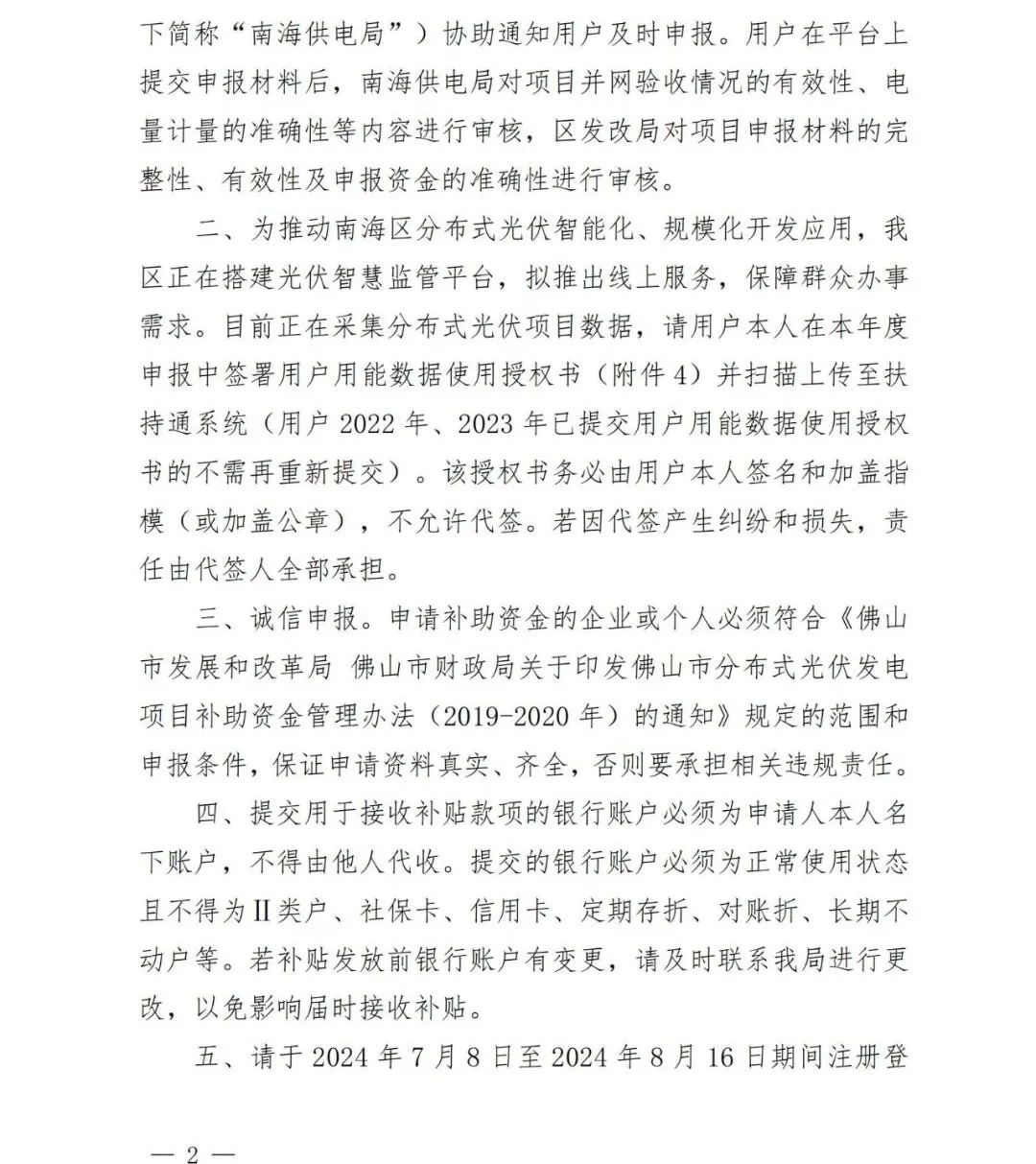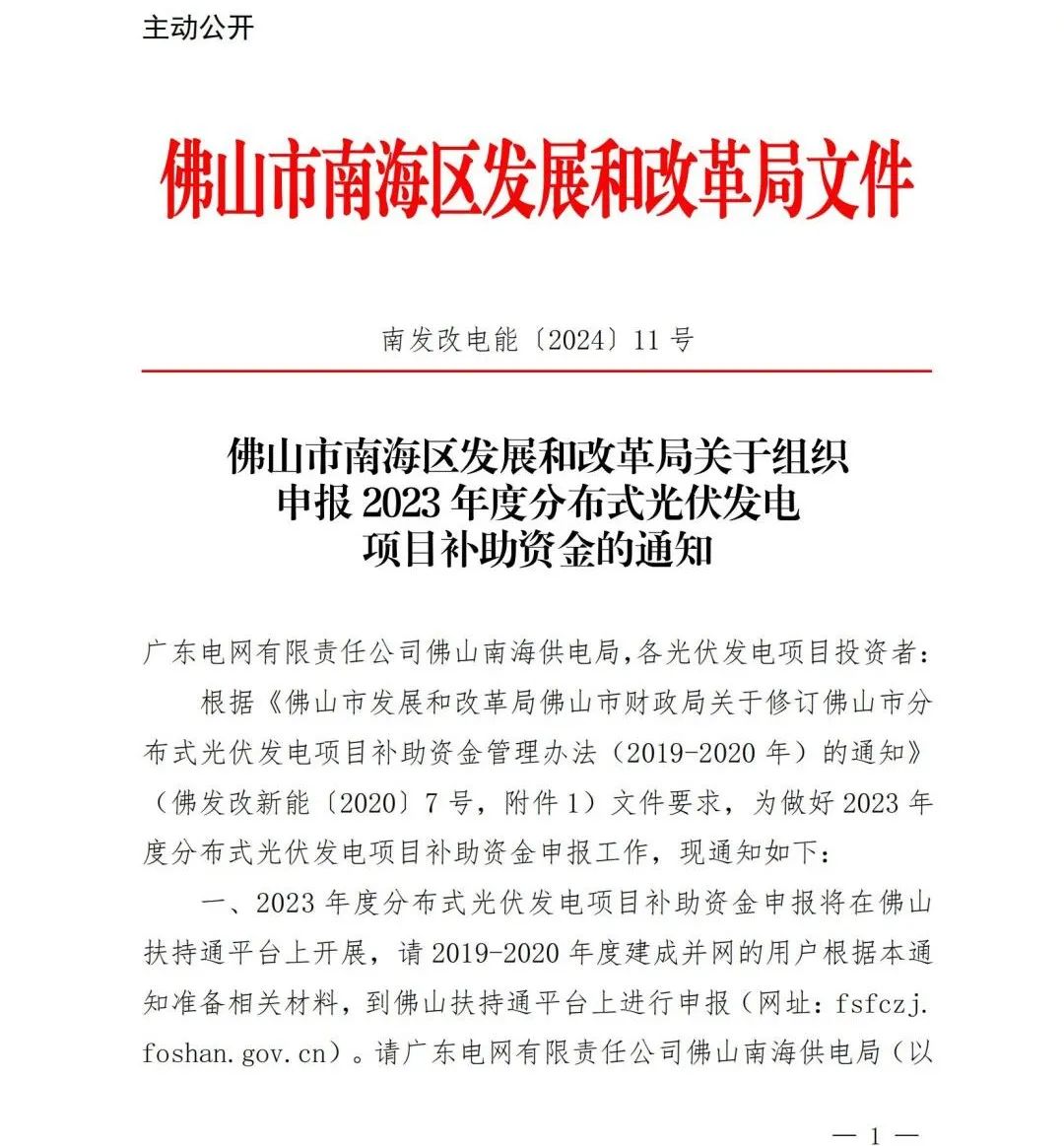 7月5日,广东佛山市南海区发展和改革局发布关于组织申报2023年度分布式光伏发电项目补助资金的通知。