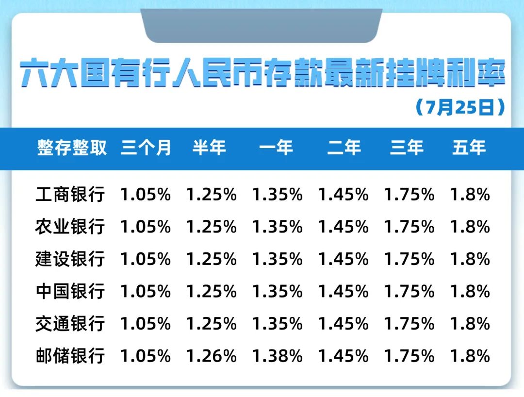 7月25日,工商银行、农业银行、建设银行、中国银行、交通银行、邮储银行六大国有银行集体宣布下调存款挂牌利率。