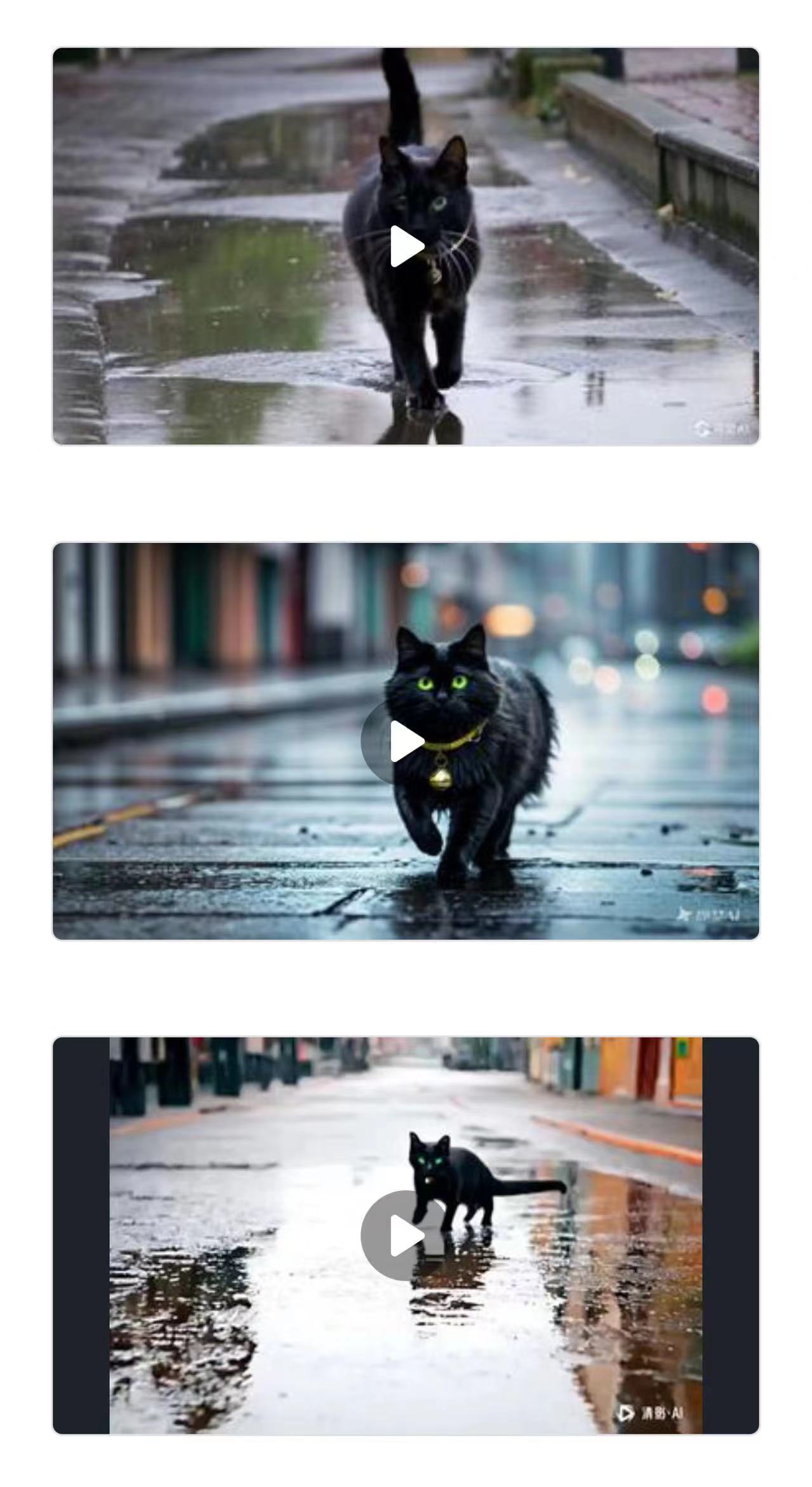 近日,「市界」以一段“黑猫”为关键词,在可灵、即梦,以及智谱AI刚刚上线的“清影”中分别输入了相同的提示:“下雨天的城市街道上空无一人,一只可爱的黑猫奔跑而过。它的眼珠是绿色,脖子上带有黄色的项圈和铃铛,全身长着黑亮的长毛。视频用摄像机的视角拍摄,地面的积水反射出黑猫的身影。”