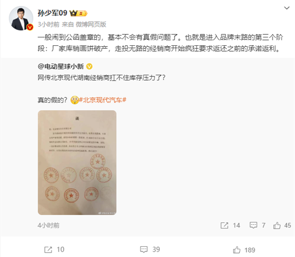 从盖章来看,此次共有九家经销商参与,知名汽车博主、汽车行业从业者“孙少军”也关注到这件事,其表示: