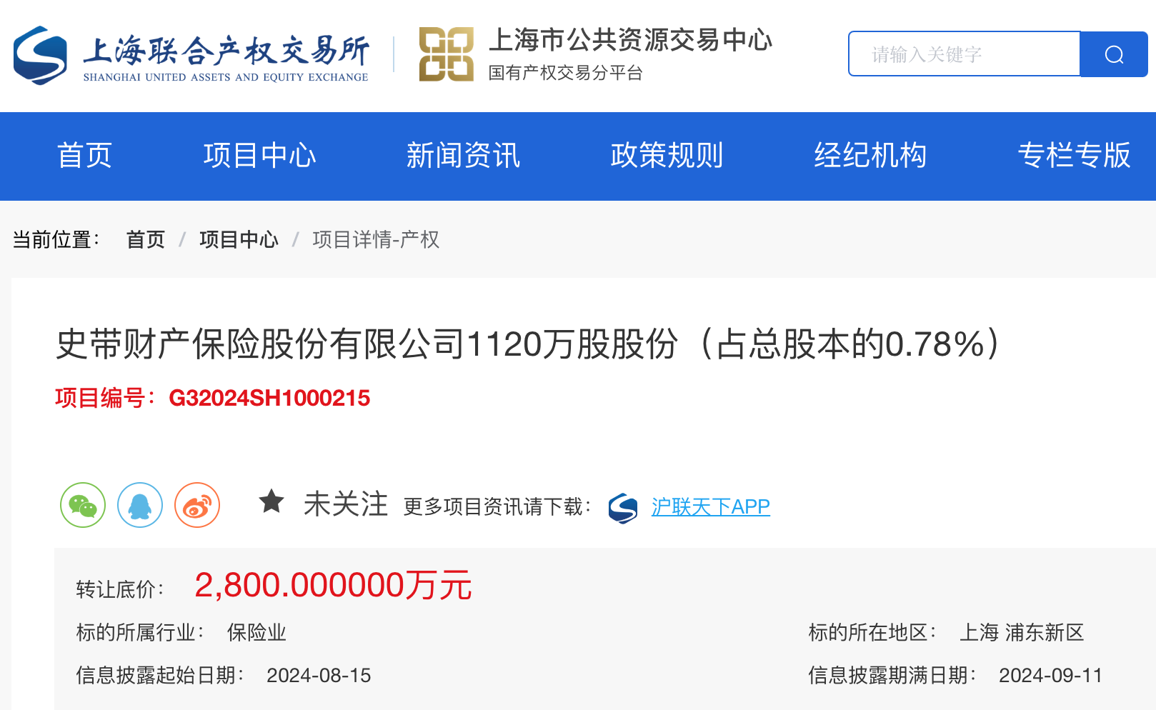 瑞财经 徐迪8月15日,史带财产保险股份有限公司1120万股股份(占总股本的0.78%)在上海联合产权交易所挂牌转让,底价2800万元,转让方为上海锦江国际投资管理有限公司。