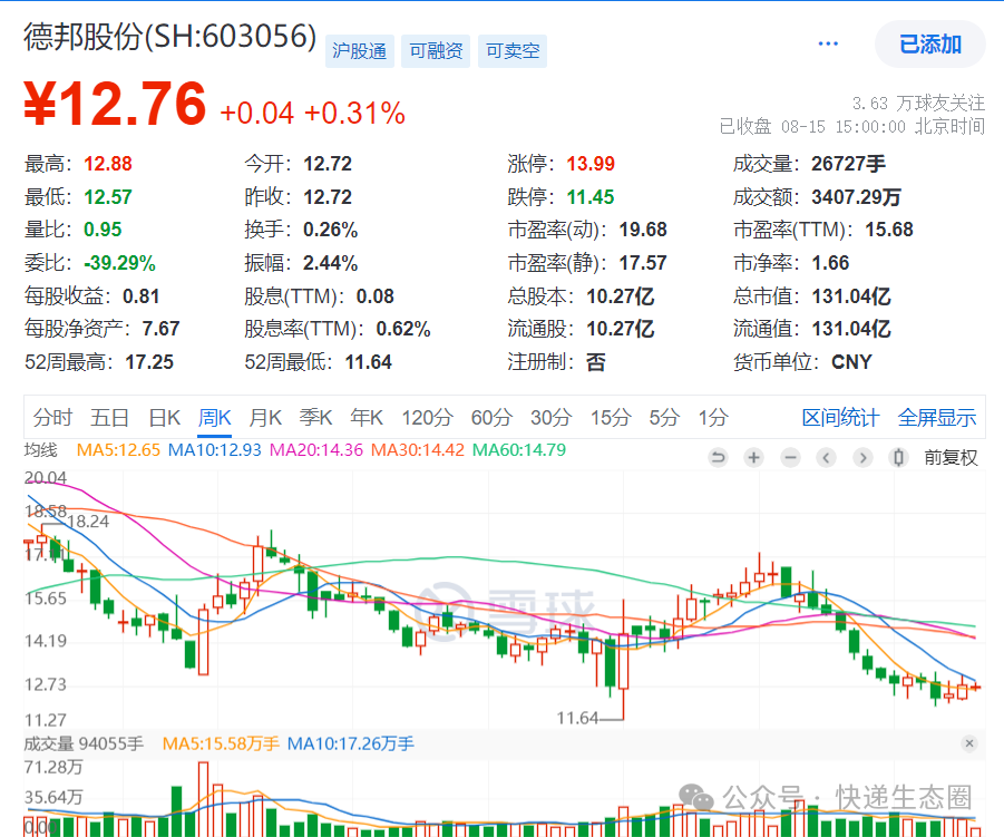 年初至今,德邦股份股价下跌12%,公司最新市值131亿人民币。