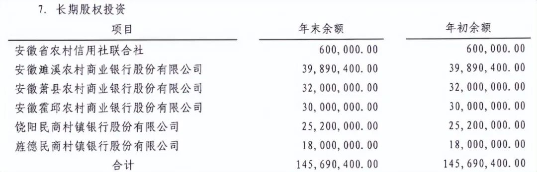 在长期股权投资方面,2023年年报显示淮北农商行对安徽霍邱农商行长期股权投资2000万元。但在审计报告中,该行对安徽霍邱农商行的长期股权投资为3000万元,存在1000万元的“缺口”。