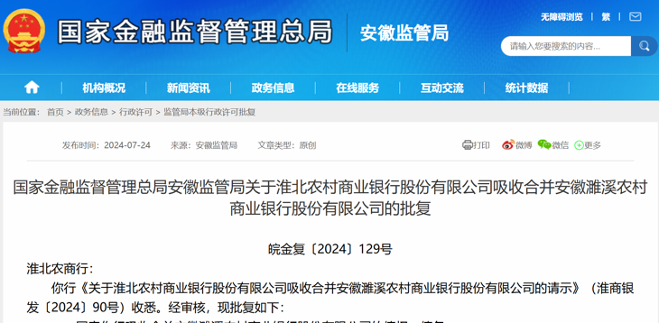 7月24日,国家金融监督管理总局发布《国家金融监督管理总局安徽监管局关于淮北农村商业银行股份有限公司(以下简称“淮北农商行”或“淮北农商银行”)吸收合并安徽濉溪农村商业银行股份有限公司的批复》。