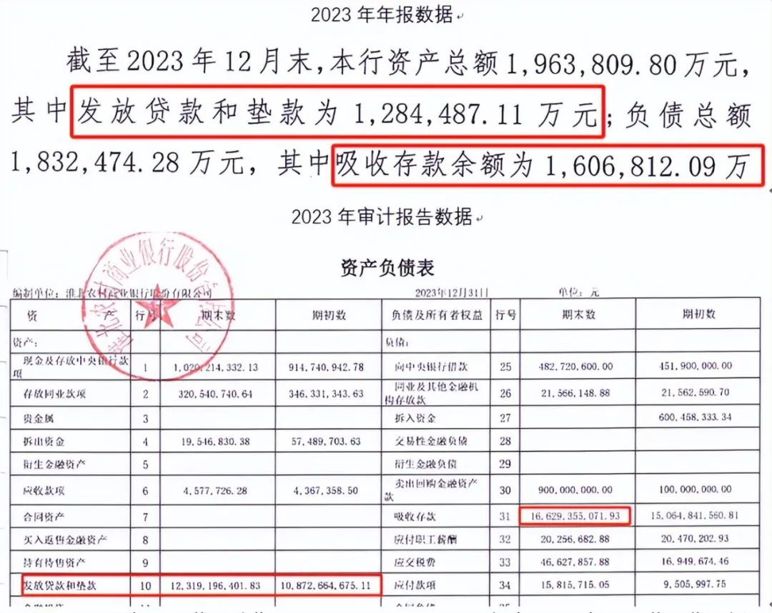 例如,2023年年报数据显示,淮北农商行发放贷款和垫付款1284487.11万元,但审计报告显示,该行发放贷款和垫付款1231919.64万元;此外,年报显示,该行吸收存款1606812.09万元,但审计报告则披露其吸收存款1662935.51万元;