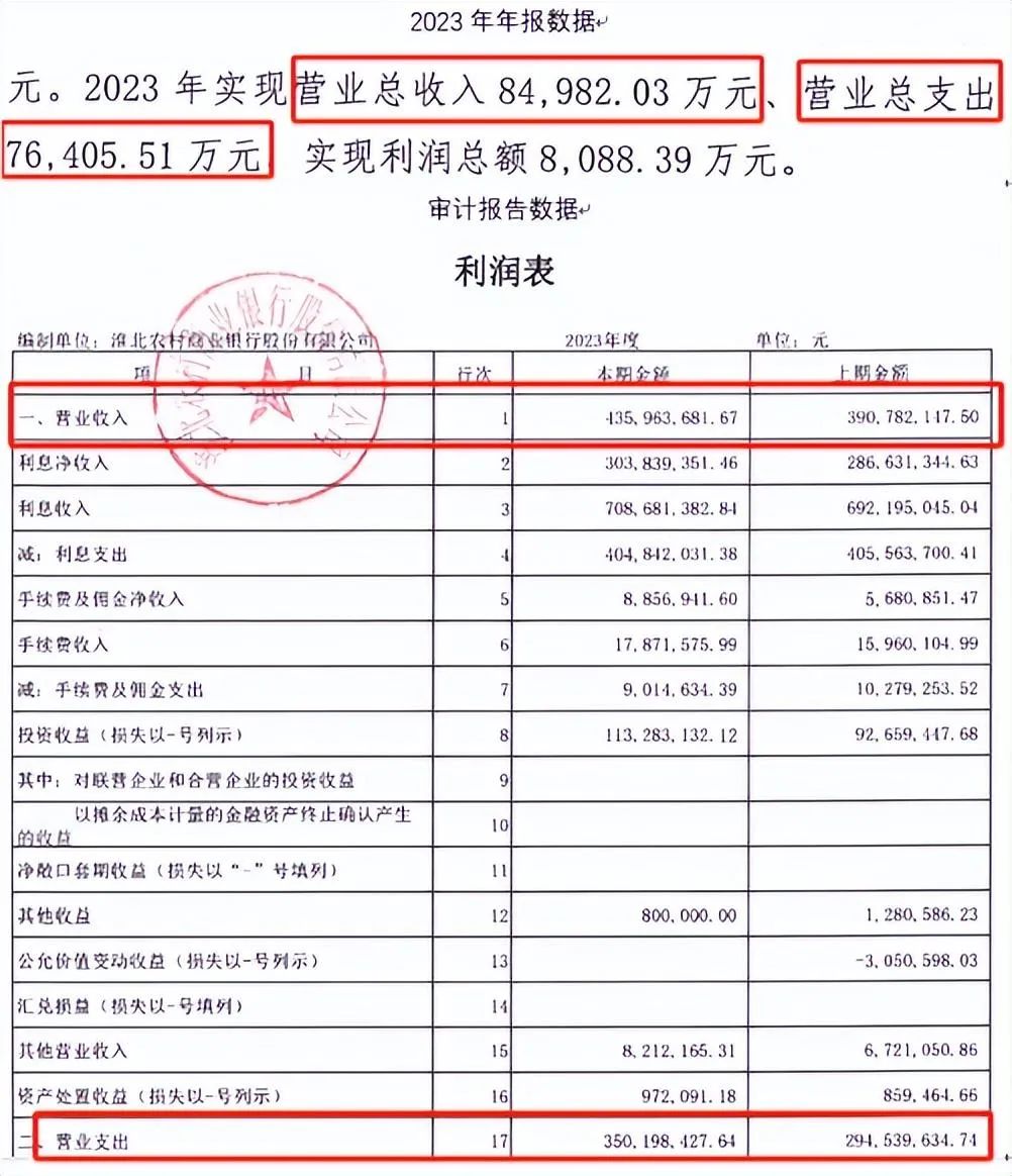 其次,2023年年报数据显示淮北农商行营业总收入为84982.03万元,但审计报告数据中,该行营业收入额为43596.37万元;同样的,年报数据显示该行营业总支出76405.51万元,但审计报告中的淮北农商行营业支出额为35019.84万元;