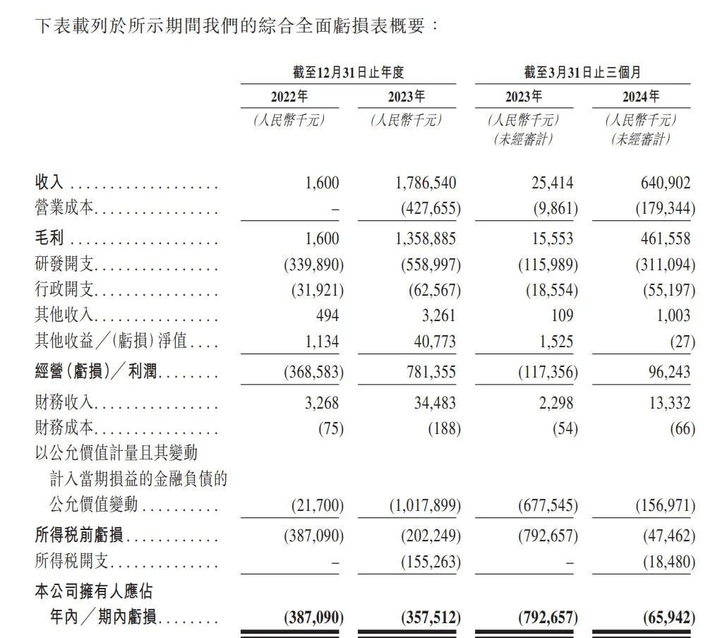 财务方面,于2022年、2023年、2024年截至3月31日止三个月,映恩生物的收入分别约为160万元、17.87亿元、6.41亿元人民币;期内亏损分别约为3.87亿元、3.58亿元、6594.2万元人民币。