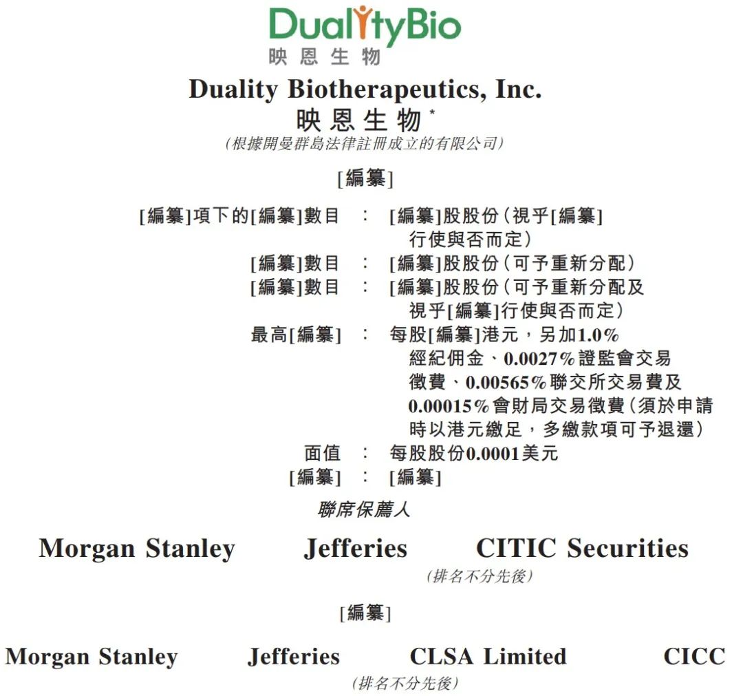 智通财经APP获悉,据港交所8月26日披露,映恩生物(Duality Biotherapeutics, Inc.)向港交所主板提交上市申请,Morgan Stanley、Jefferies、CITIC Securities为联席保荐人。