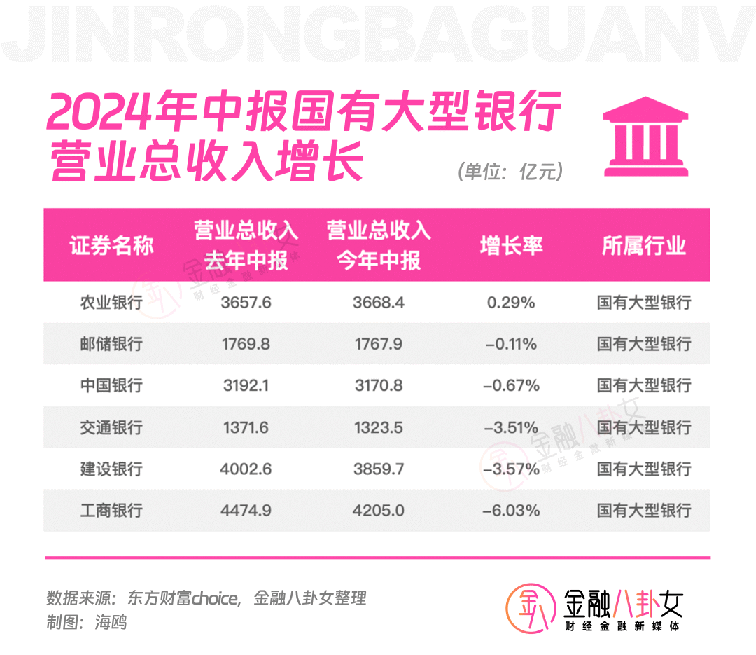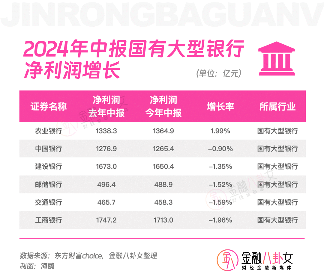 值得注意的是,六大行净利润增幅均有所放缓,其中5家增速都为负数:只有农行的净利润增长了1.99%,其他5家银行的净利润都下滑了约1%。