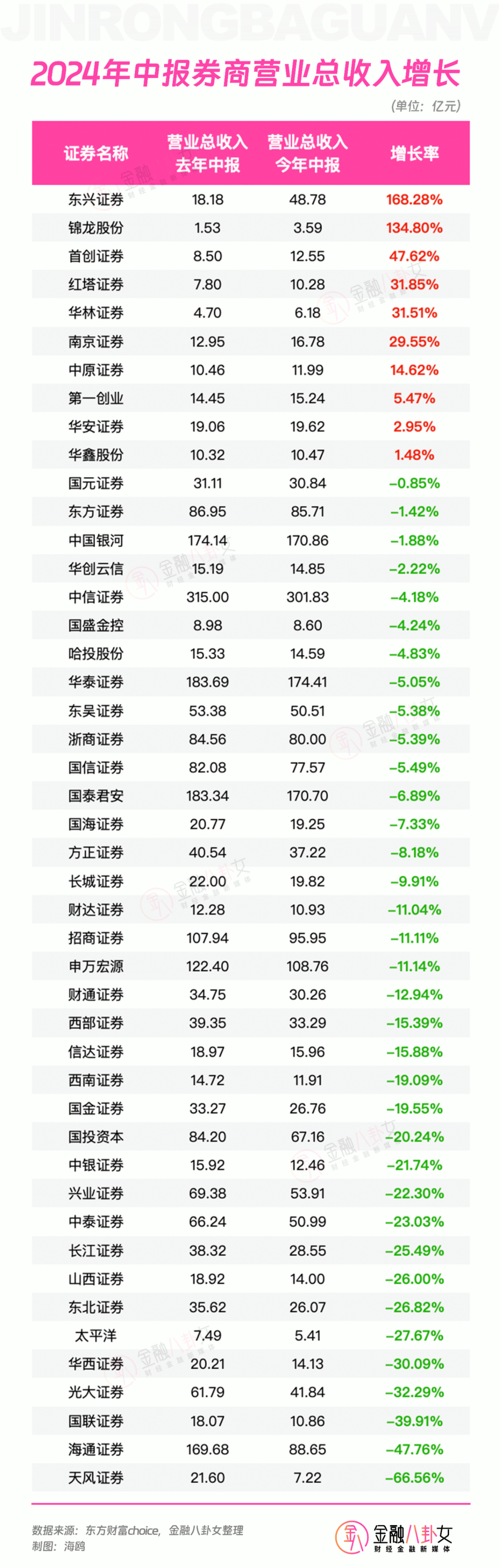 从总营收增速来说,前三分别是东兴证券、锦龙股份和首创证券,增长率分别为168%、135%和48%,不过这三家的规模都不大,营收都在百亿以内。