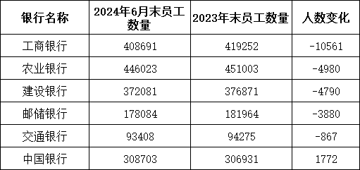 另外,半年报数据显示,相比2023年底,2024年中期42家A股上市银行员工数量减少超3万人,其中国有六大行整体减员超2万人,不过中国银行增加了1772人。