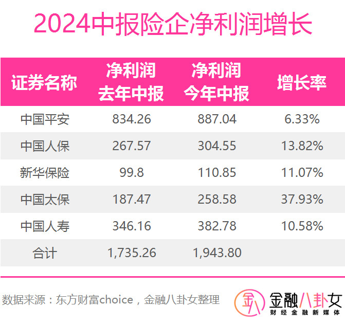 5家上市险企,净利润全部都在增长,从最低6%到最高37.9%,平均每家增长15.9%,净利润总规模1943.9亿。