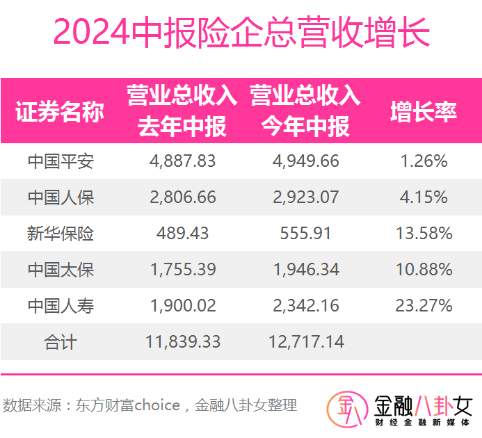 今年上半年,5家上市险企净利润全部增长,从最低6%到最高37.9%,平均每家增长15.9%,净利润总规模1943.9亿。五家险企的合计营业总收入1.27万亿,比去年的1.18万亿增长了900多亿。