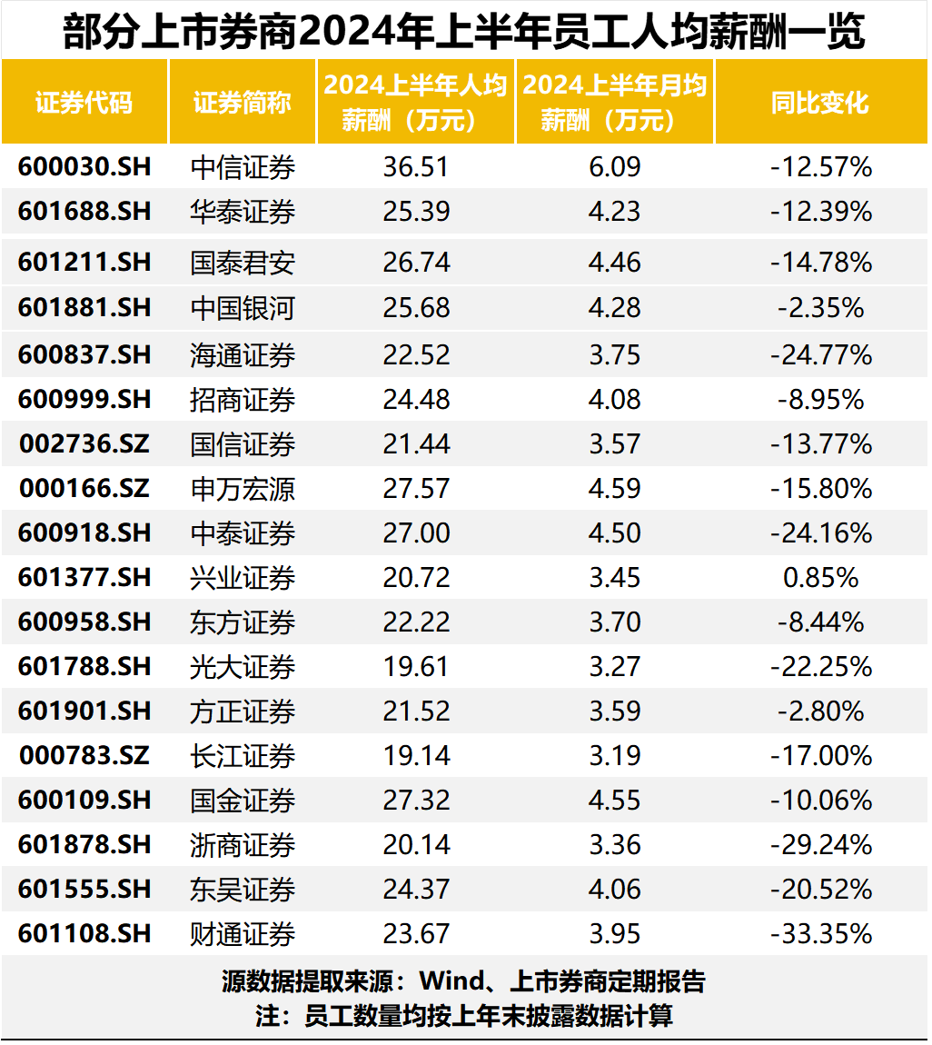 具体来看,A股43家直接上市券商上半年薪酬总额745.71亿,同比减少103.14亿,超八成券商员工人均薪酬减少。