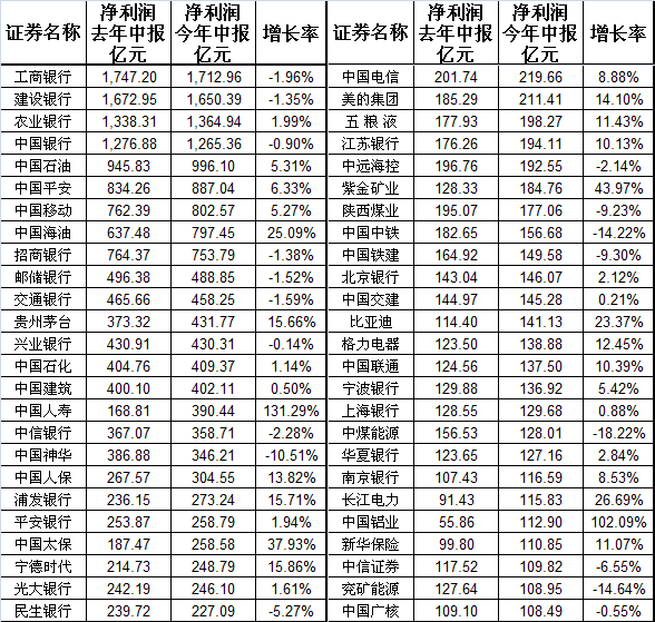 不只是业绩集体增长,还有一点,在今年全部的五千多家上市公司中,净利润前50名当中,5家保险全部入围,银行入围了19家,然后是三桶油、三大运营商,几家煤矿,宁王和比亚迪,茅台和五粮液等等: