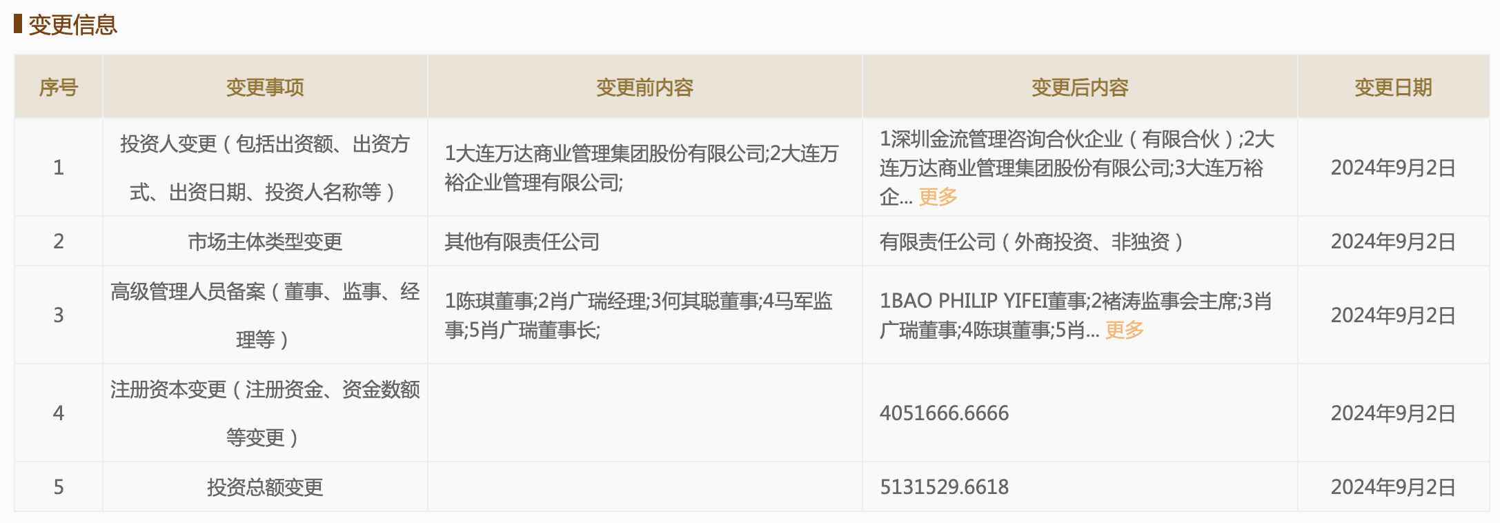 投资人在原有的大连万达商业管理集团股份有限公司和大连万裕企业管理有限公司以外,新增深圳金流管理咨询合伙企业、苏州纽达企业管理咨询合伙企业,以及Riverside Heights Pte. Ltd.等8家外资企业。