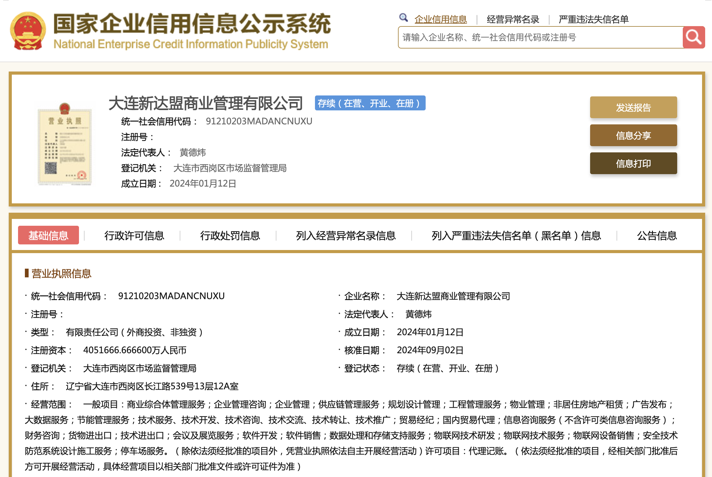 大连新达盟商业管理有限公司是万达集团新包装出来的轻资产平台,今年1月12日正式注册成立,业务涵盖商业综合体管理服务、企业管理咨询、供应链管理服务等。