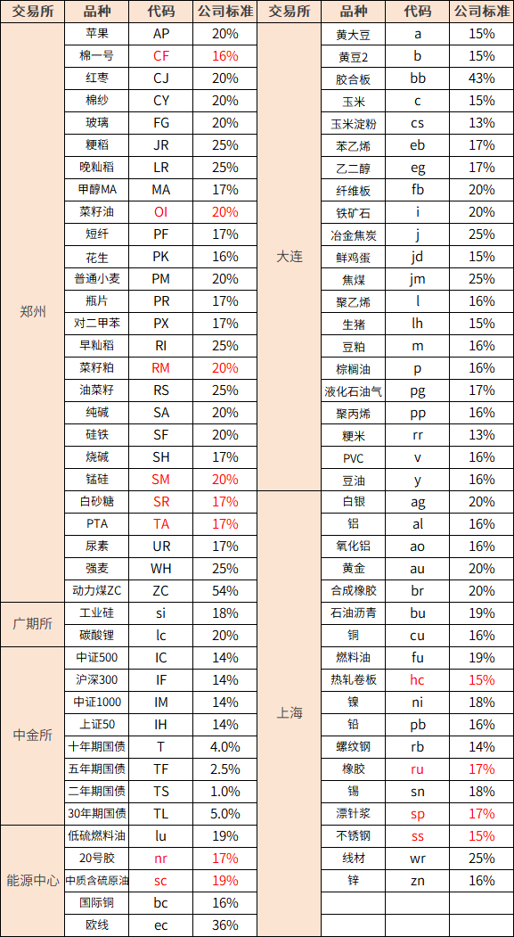 自2024年9月12日(星期四)结算时起,将调整各品种公司默认保证金比例如下: