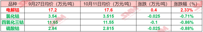 国庆归来首周,钴系产品报价涨跌不一,电解钴现货报价在节前宏观氛围的推动下上涨之后,本周受益于下游刚需采买,价格继续上涨,后续是否能保持坚挺势头?钴盐何时能够止跌?SMM整理了国庆之后首周钴系产品的价格变动情况,具体如下:
