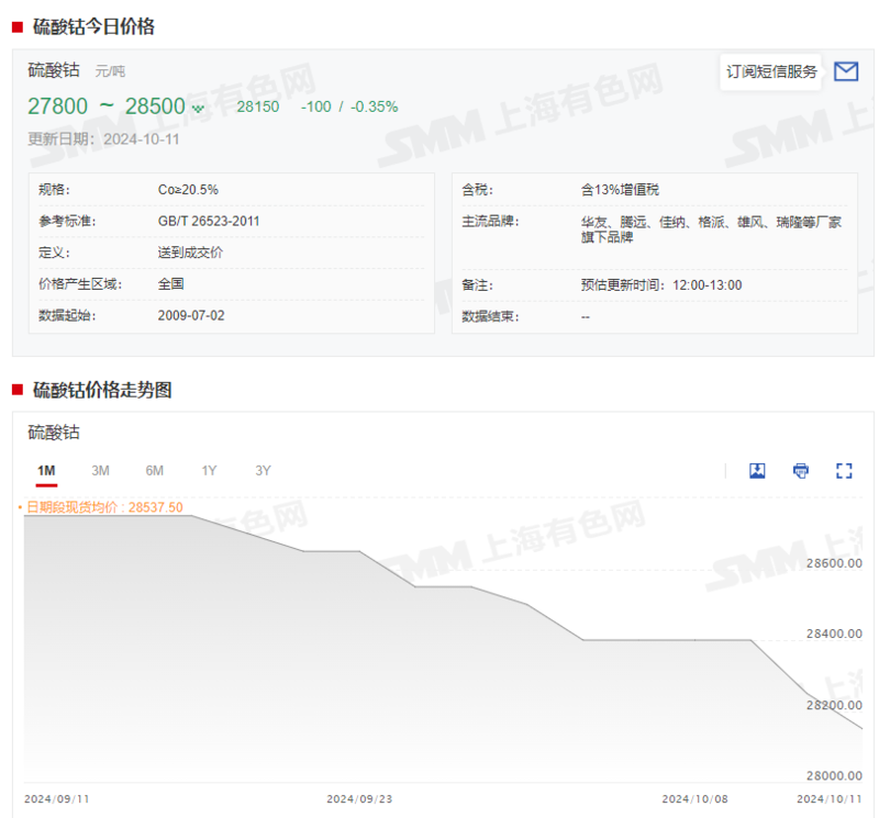 硫酸钴方面,据SMM现货报价显示,硫酸钴现货报价在本周最后两个交易日接连下探,截至10月11日,硫酸钴现货报价跌至27800~28500元/吨,均价报28150元/吨,相较9月27日下跌250元/吨,跌幅达0.88%。
