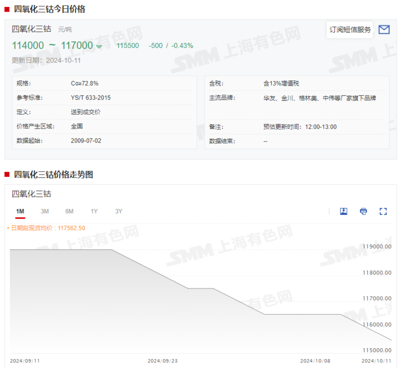 据SMM现货报价显示,四氧化三钴现货报价本周维持下跌态势,分别在本周最后两个交易日接连下跌,截至10月11日,四氧化三钴现货报价跌至11.4~11.7万元/吨,均价报11.55万元/吨,相较9月27日跌去1000元/吨,跌幅达0.86%。