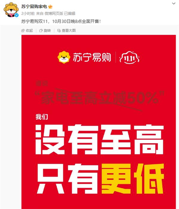 但苏宁易购家电最新一条微博则疑似对此进行了回应,配图文案为:“谁说家电至高立减50%,我们没有至高,只有更低。”