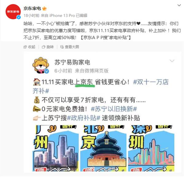 京东家电则发博表示:“哈哈,一不小心‘被抢镜’了,感谢苏宁小伙伴对京东的支持。”“我们不止7折,至高立减50%哦”。