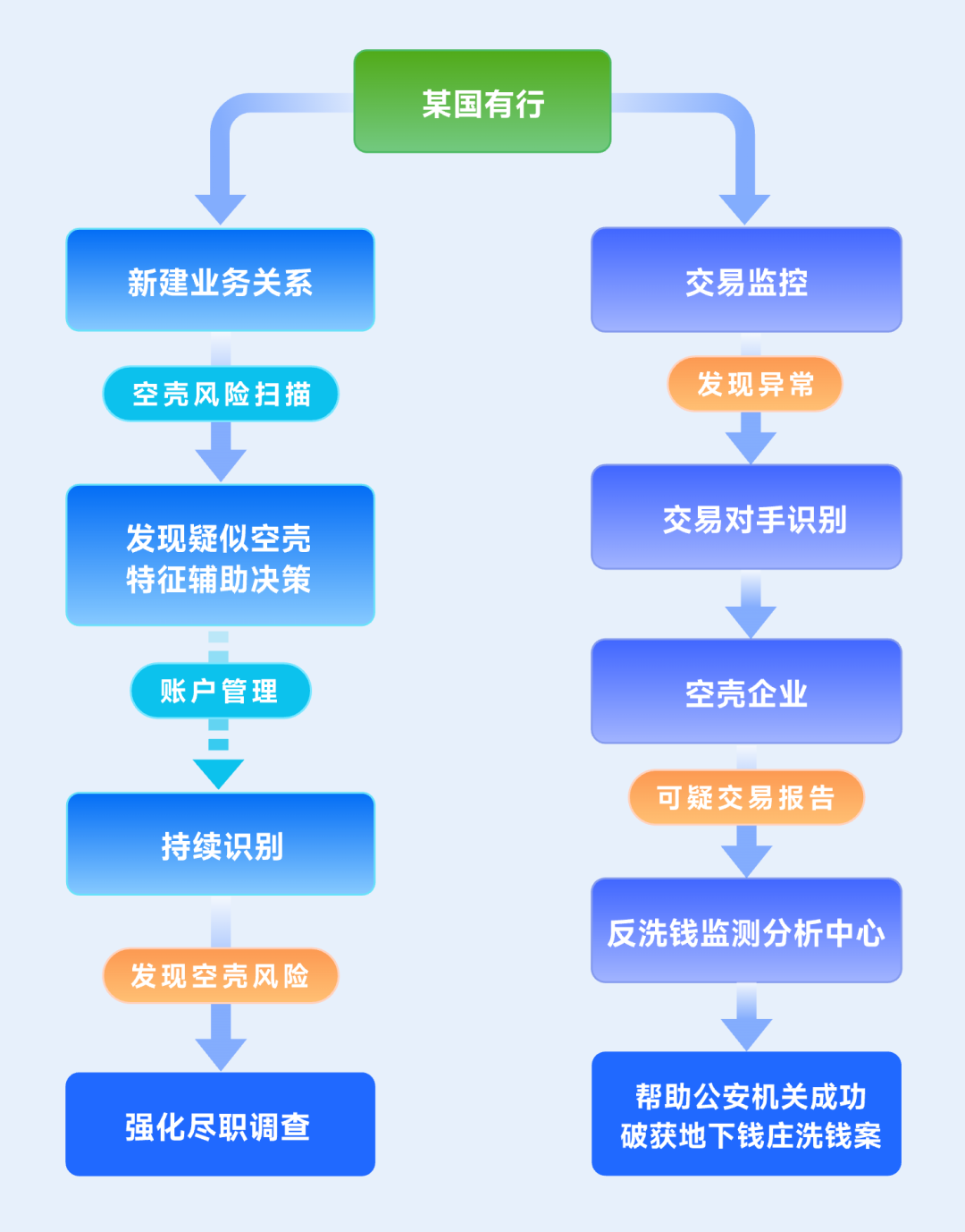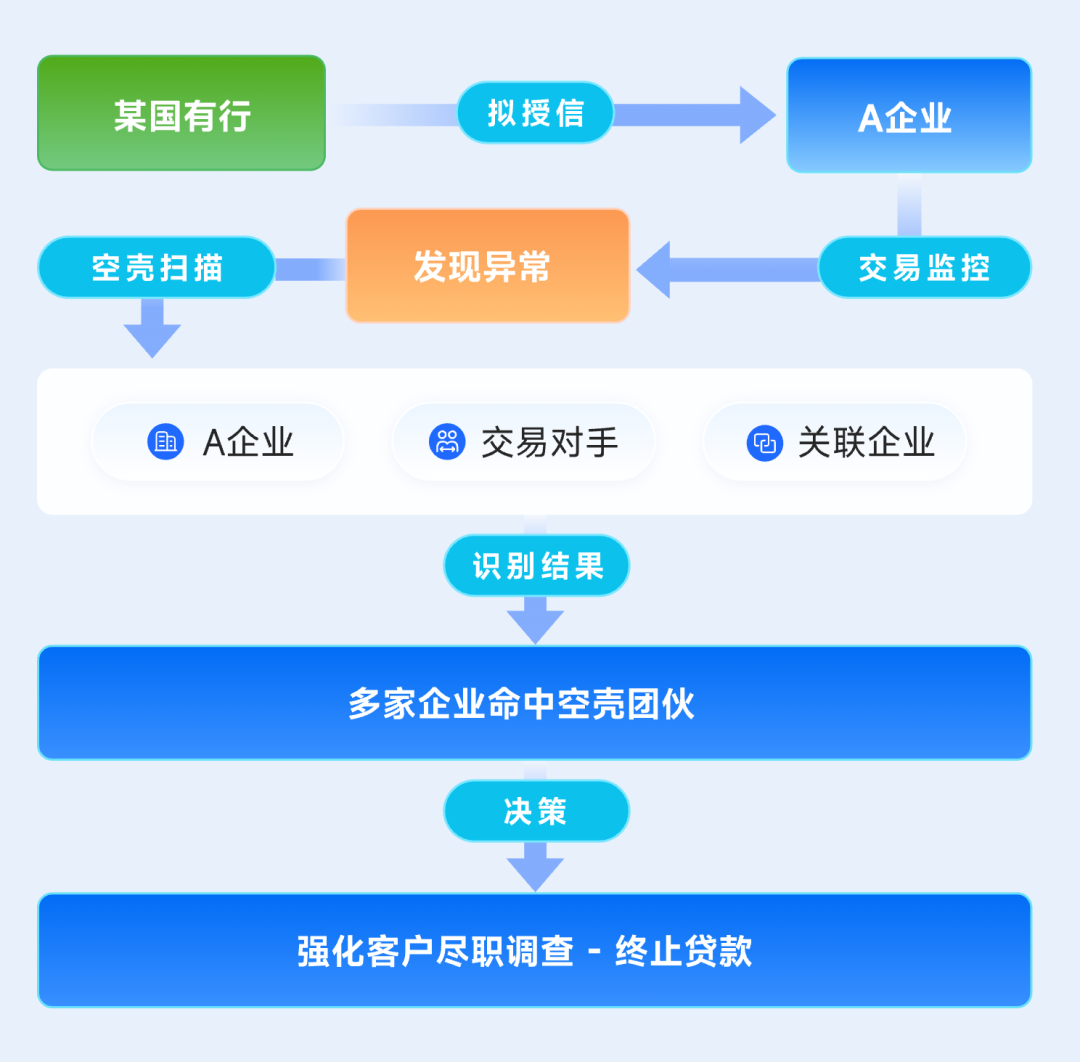银行需求:该银行希望在客户尽职调查及可疑交易分析场景中加强对于空壳公司的洗钱风险防范能力。除了在对公开户等新建业务关系时,需要识别目标企业的空壳风险,从而决策是否要与它建立业务关系,在存续期间,仍要持续监控空壳风险变化。尤其是对发现交易异常的企业,其资金流向的交易对手也是空壳公司风险扫描的重点对象。