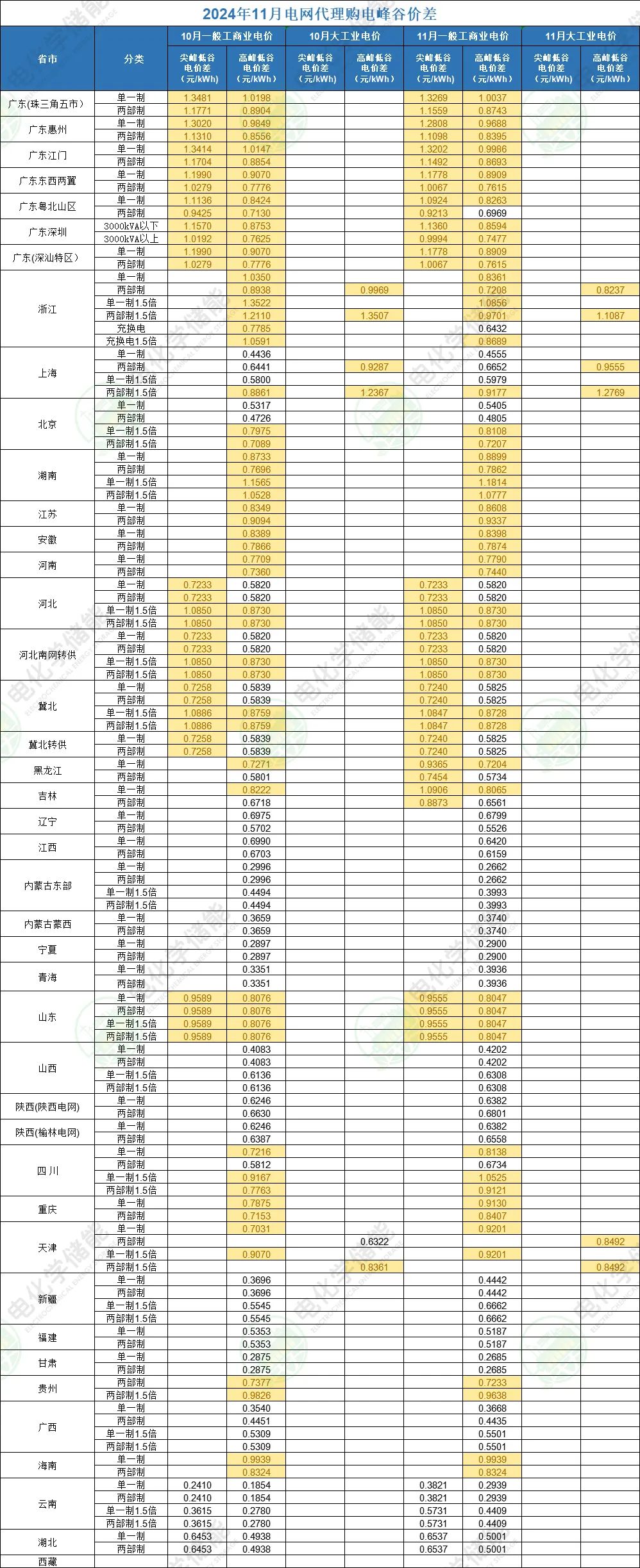 进入11月,仅有广东、吉林、河北、山东、黑龙江等地执行尖峰电价,吉林、河北、黑龙江也因此超过了江苏,列入峰谷价差的TOP10。此外南网区域的海南、贵州最大峰谷价差也接近1元。
