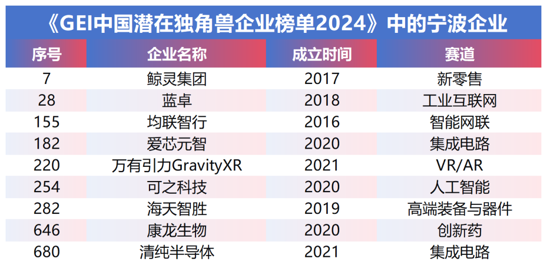 宁波共有9家企业榜上有名,分别是鲸灵集团(第7位)、蓝卓(第28位)、均联智行(第155位)、爱芯元智(第182位)、万有引力Gravity XR(第220位)、可之科技(第254位)、海天智胜(第282位)、康龙生物(第646位)、清纯半导体(第680位)。