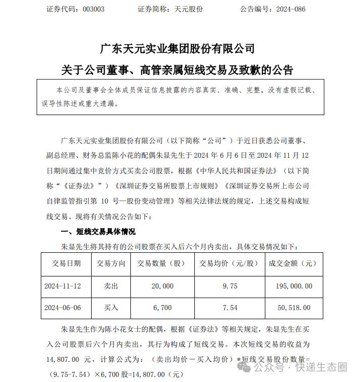 11月13日,天元股份(003003.SZ)公告称,公司董事、副总经理、财务总监陈小花的配偶朱显于2024年6月6日至2024年11月12日期间通过集中竞价方式买卖公司股票,根据《中华人民共和国证券法》(简称“《证券法》”)《深圳证券交易所股票上市规则》《深圳证券交易所上市公司自律监管指引第10号—股份变动管理》等相关法律法规的规定,上述交易构成短线交易。