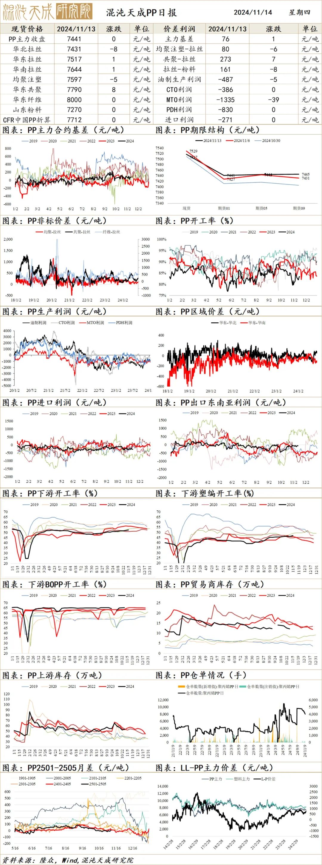 需求端:截至11.7日,下游多数开工恢复中,塑编、无纺布等开工上升,其他开工小幅下降。PP下游行业平均开工升0.5至52。5%。