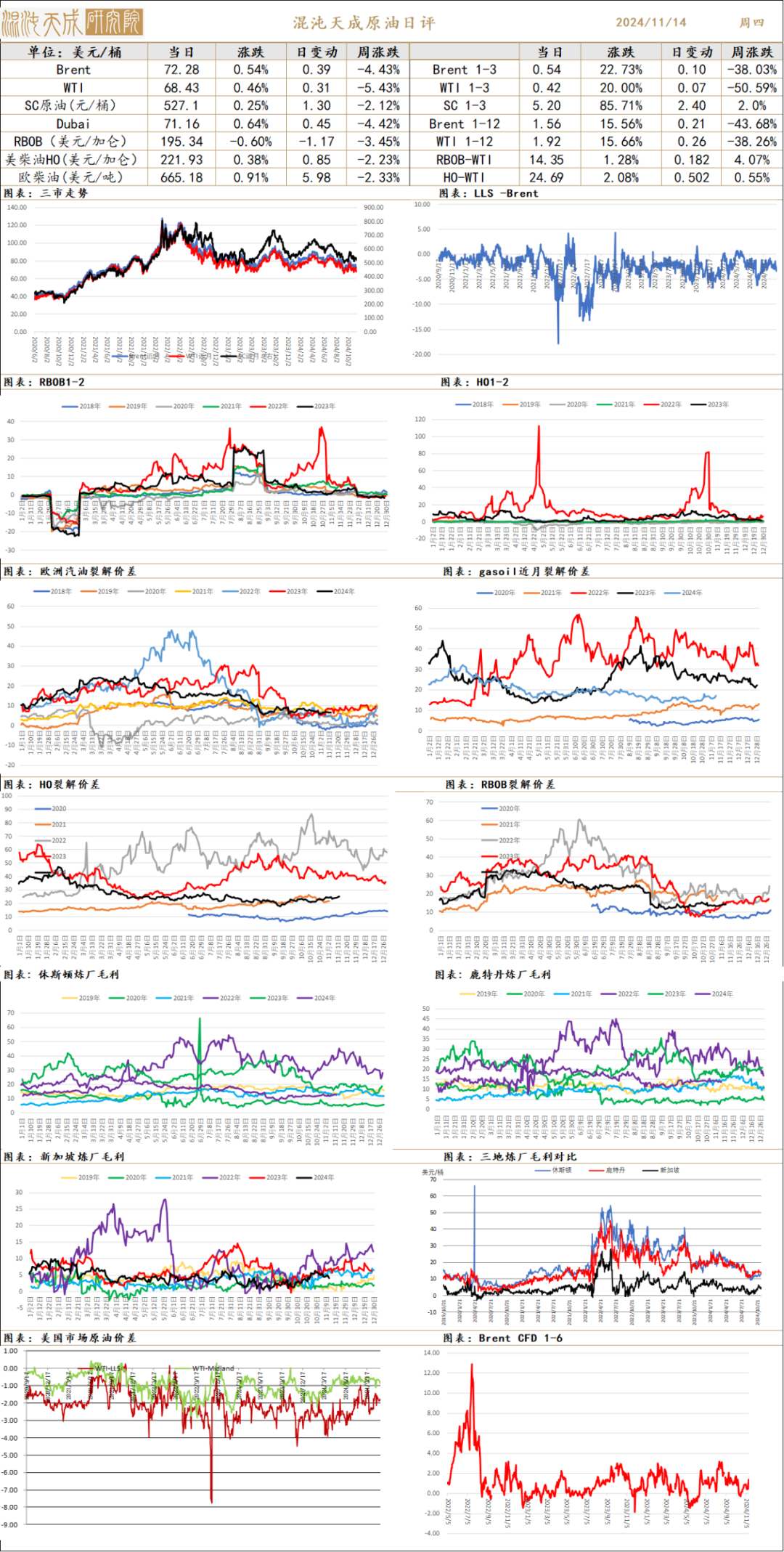 库存端:截至2024年11月8日,API数据显示商业原油去库77.7万桶,汽油累库114万桶,馏分油累库31万桶。