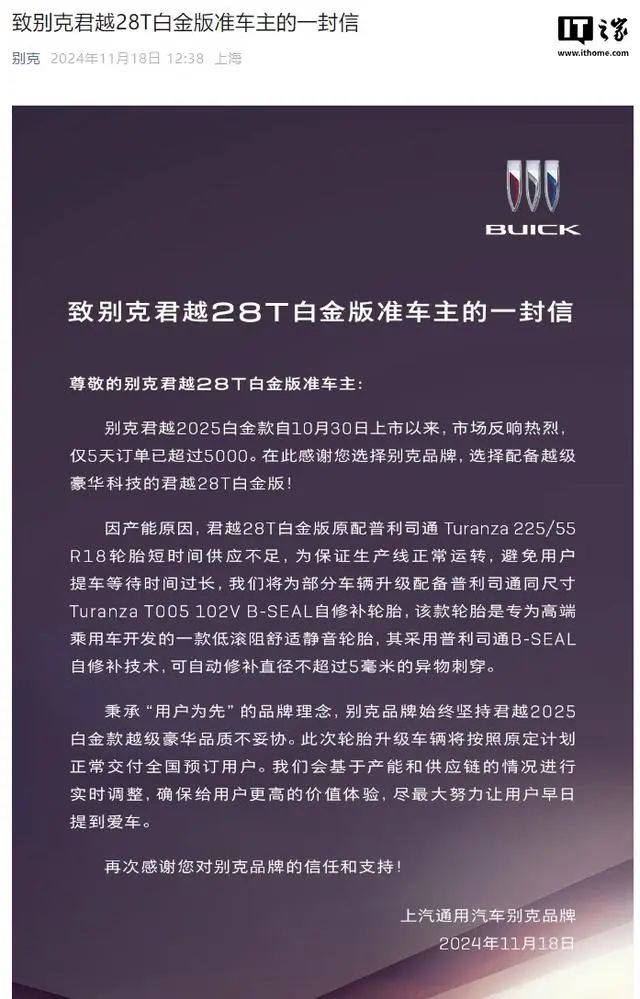 11 月 18 日消息,别克汽车今日发布公告称:因产能原因,君越 28T 白金版原配普利司通 Turanza 225/55R18 轮胎短时间供应不足,为保证生产线正常运转,避免用户提车等待时间过长,公司将为部分车辆升级配备普利司通同尺寸 TuranzaT005 102V B-SEAL 自修补轮胎。