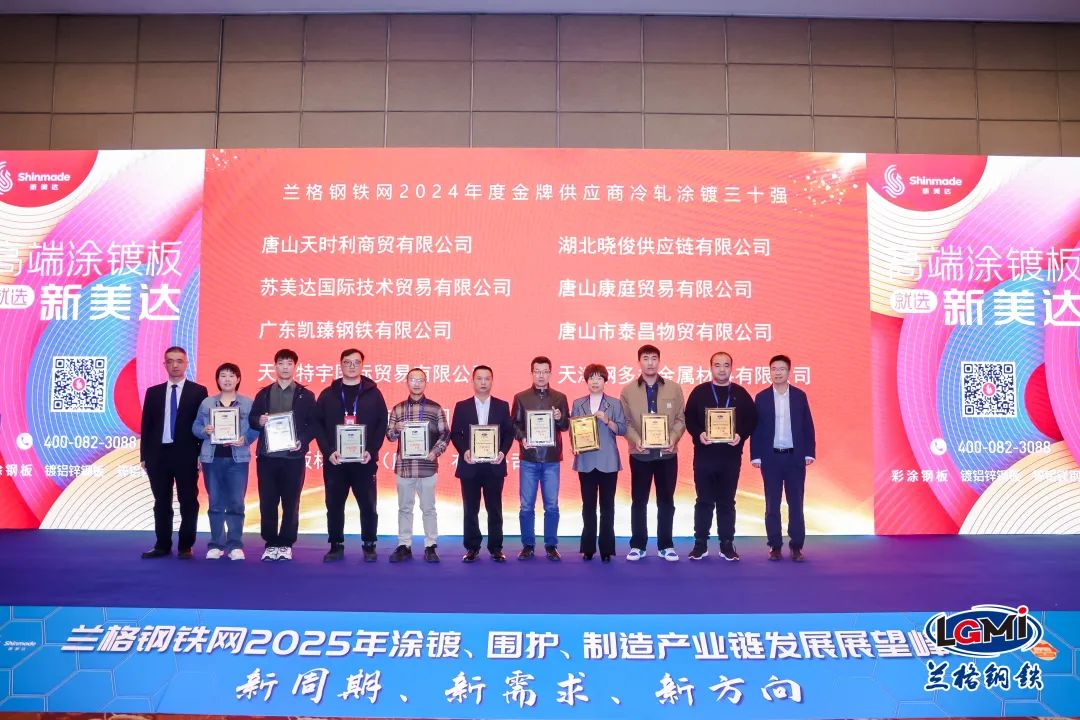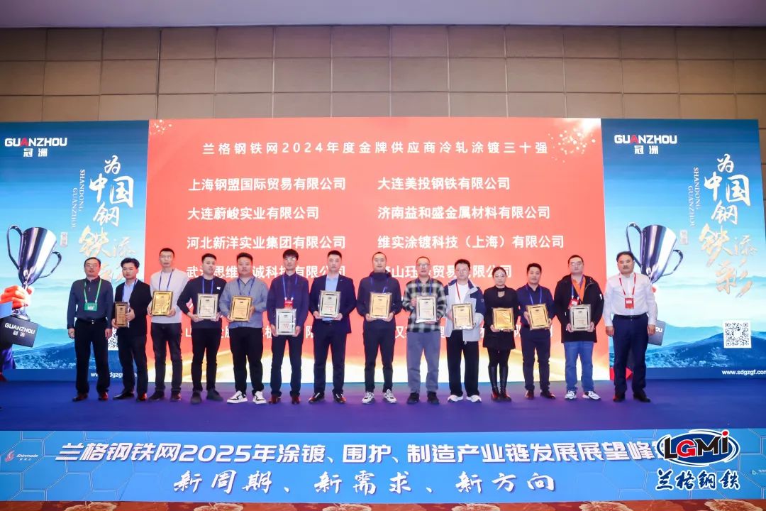 会上还举行了隆重的“兰格钢铁网2024年度金牌供应商冷轧涂镀30强”颁奖典礼,兰格钢铁网高品钢事业部总经理李钊、山东冠洲股份有限公司副总经理宋总、山东新美达科技材料有限公司副总裁魏加铭、敬业集团高品钢营销部长杨世祺等领导为获奖企业颁发奖牌。