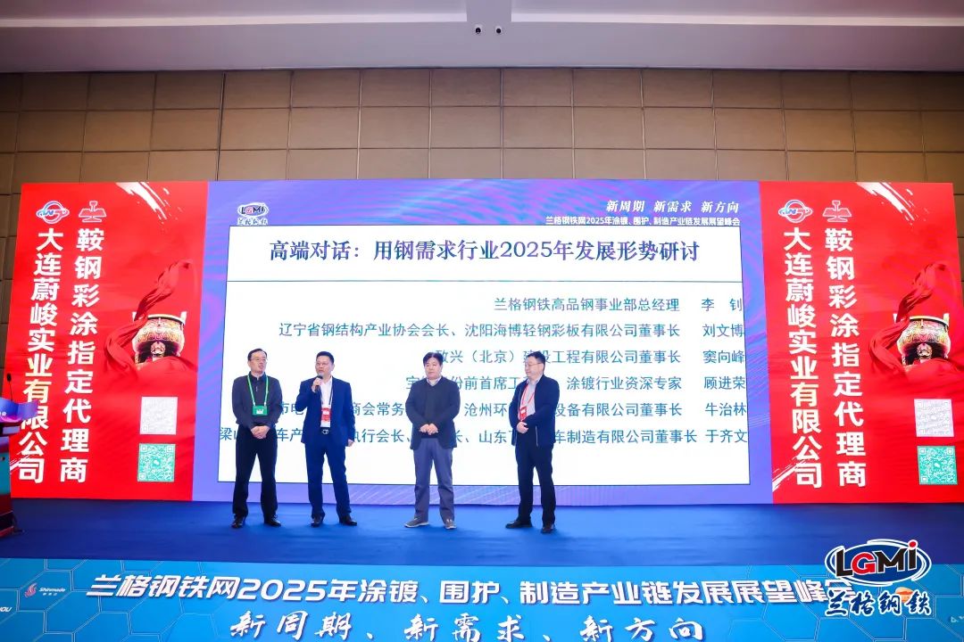 在高端对话环节,在兰格钢铁网高品钢事业部总经理李钊的主持下,宝钢股份前首席工程师、涂镀行业资深专家顾进荣,梁山县汽车产业协会执行会长、秘书长,山东飞驰汽车制造有限公司董事长于齐文,致兴(北京)建设工程有限公司董事长窦向峰等几位嘉宾共同探讨了2025年行业发展前景。会议圆满落下帷幕。
