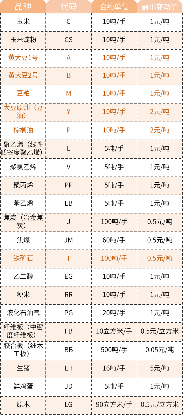 (注:上表中标橙色的品种属于特定品种,即经证监会批准,允许境外投资者投资的期货品种。)