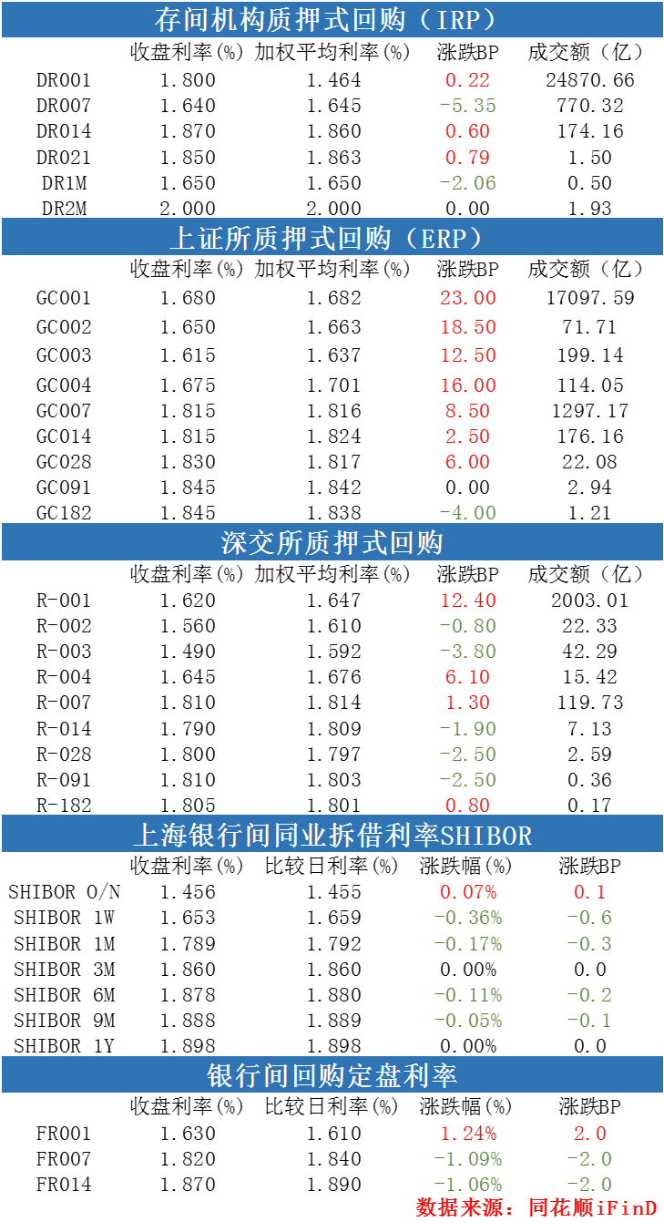 银存间质押式回购利率涨跌互现。1天期品种报1.4635%,涨0.22个基点;7天期报1.6451%,跌5.35个基点;14天期报1.8598%,涨0.6个基点。上海银行间同业拆放利率(Shibor)多数下跌,隔夜shibor报1.456,涨0.1个基点;7天shibor报1.653,跌0.6个基点;1月shibor报1.789,跌0.3个基点;3月shibor报1.86%,涨0个基点。银行间回购定盘利率多数下跌。FR001报1.63%,涨2个基点;FR007报1.82%,跌2个基点;FR014报1.87%,跌2个基点。