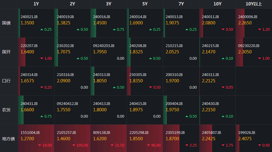 债券方面,截至发稿,银行间主要利率债活跃券收益率普遍下行,10年期国债活跃券240011收益率下行0.70BP至2.0780%,10年期国开债活跃券240215收益率下行0.10BP至2.1450%,30年期国债2400006收益率下行1.95BP至2.2575%。国债期货收盘涨跌互现,30年期主力合约涨0.48%,10年期主力合约涨0.02%,5年期主力合约跌0.07%,2年期主力合约跌0.06%。